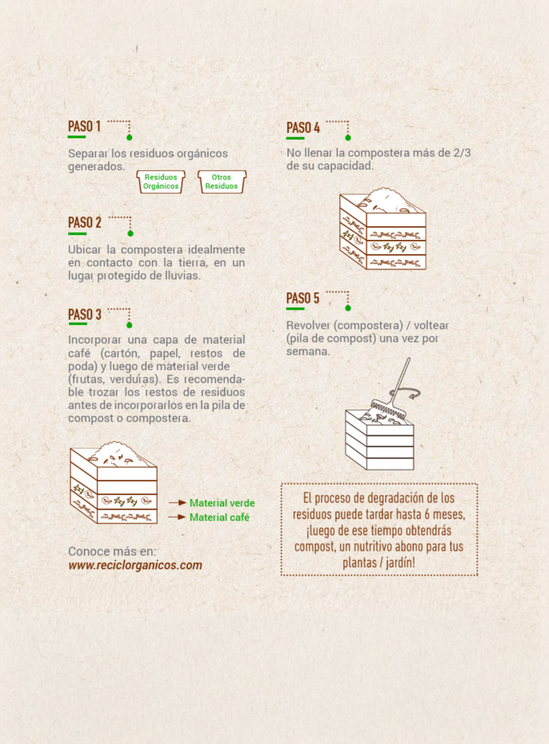 Consejo: alterna siempre materiales “verdes” (húmedos) con “cafés” (secos) para mantener el equilibrio y evitar malos olores.