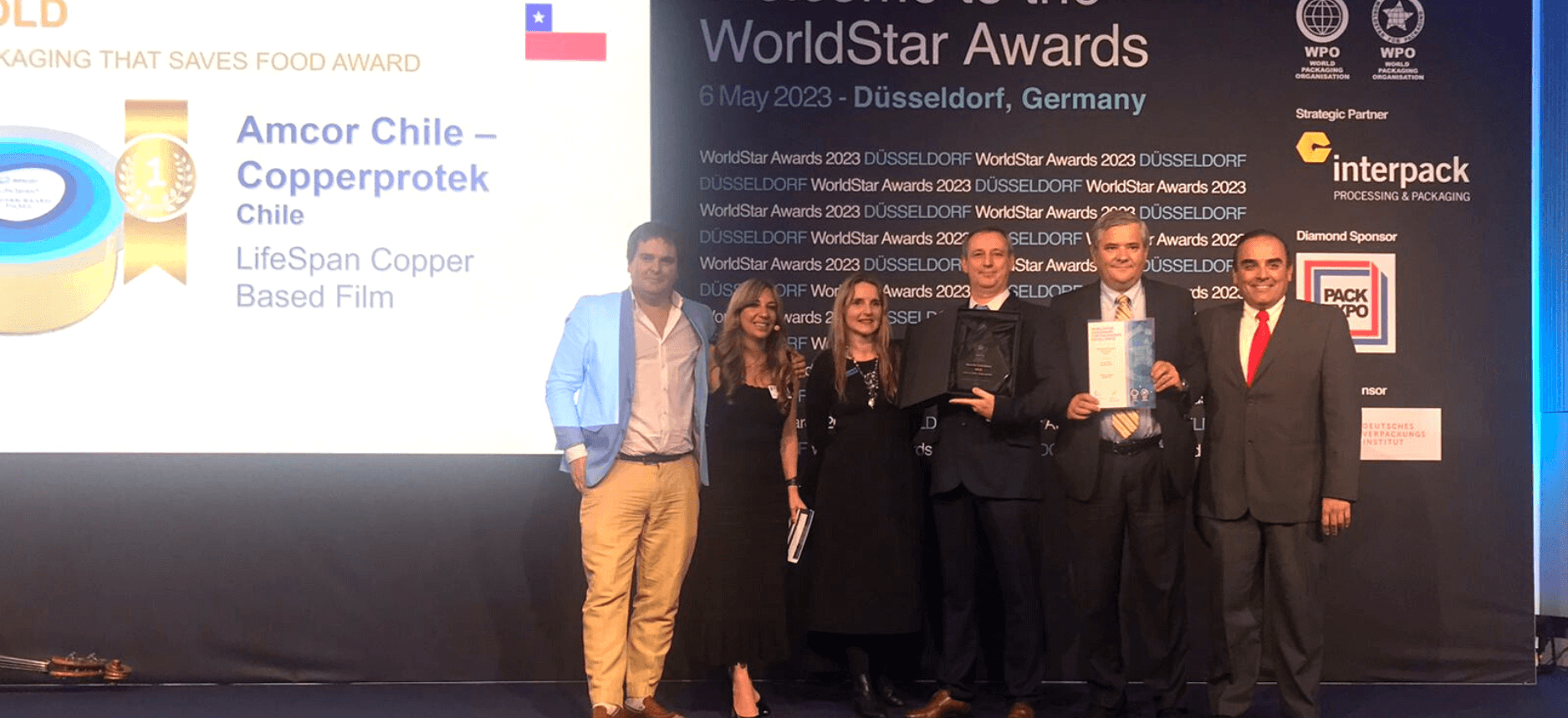 Amcor, en colaboración con Copperprotek, fueron reconocidos como ganadores ORO de la categoría especial Packaging That Saves Food en los WorldStar Awards 2023, la competencia global de packaging organizada por la WPO.El anuncio se realizó durante la Cena de Gala que se llevó a cabo el 6 de mayo en el marco de la feria Interpack en Düsseldorf, Alemania, convirtiendo de esta forma a Chile en el único país a nivel Latinoamericano en lograr tan importante reconocimiento de clase mundial.Luego del primer lugar obtenido en la categoría Save Food de los Premios Viva Chile Packaging 2022 organizados por CENEM, ambas compañías tuvieron la oportunidad de postular al certamen WorldStar Global Packaging Awards 2023, resultando ganadores en la categoría alimentos en primera instancia, lo que se suma a la obtención del ORO en la categoría especial Packaging That Saves Food anunciado recientemente.Lo anterior fue posible gracias al innovador producto LifeSpan® Copper, una película con micropartícula de cobre patentadas, que proporciona capacidad biocida a lámina. Esta limita el desarrollo de los microorganismos presentes, aumentando así la vida útil de alimentos hasta en un 181%.Una solución innovadora que es el resultado de dos años de colaboración entre Amcor y la empresa de biotecnología Copperprotek, con el objetivo de desarrollar una película inteligente que potenciara las propiedades antimicrobianas del cobre. “Nuestra tecnología es 100% cobre, siendo una solución natural y escalable para la industria de alimentos. La micropartícula es tan natural que nos ha permitido entrar en mercados muy exigentes, como la industria de la carne de Estados Unidos y Brasil, donde esperamos una rápida adopción”, asegura Raúl Molina, Gerente Comercial de Copperprotek.Los beneficios de esta tecnología son variados, dependiendo de su utilización: las empresas de alimentos pueden reducir su capital de trabajo, flexibilizar operaciones, minimizar la merma y disminuir devoluciones. Por su parte, el retail puede contar con productos en góndolas por más tiempo, asegurando su comercialización; mientras que el cliente final obtendrá un producto más seguro inclusive si hay cortes en la cadena de frío.“Es motivo de gran orgullo para nosotros contar con dos empresas socias que logren poner a nuestro país en el más alto nivel en cuanto a la innovación y desarrollo de packaging, más aún incorporando un elemento tan nuestro como el cobre”, declara Mariana Soto, Gerente General de CENEM.