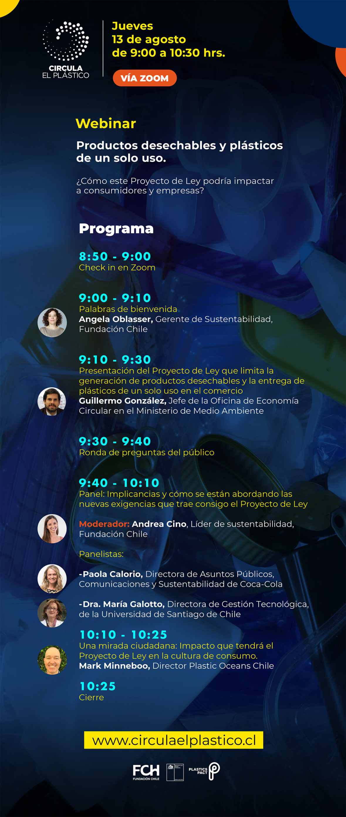 La jornada contará con la participación de Guillermo González; Jefe de la Oficina de Economía Circular del Ministerio del Medio Ambiente, Mark Minneboo, Director de Plastic Oceans Chile, Angela Oblasser, Gerente de Sustentabilidad de Fundación Chile y un panel de conversación conformado por Paola Calorio, Directora de Asuntos Públicos, Comunicaciones y Sustentabilidad de Coca-Cola; Dra. María Galotto, Directora de Gestión Tecnológica de la Universidad de Santiago de Chile y Andrea Cino, Líder de Sustentabilidad de Fundación Chile.
