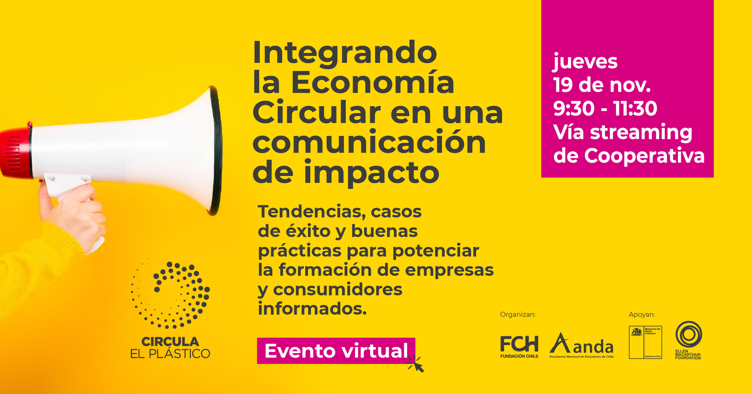 Circula el Plástico junto a Fundación Chile y la Asociación Nacional de Avisadores de Chile, Anda, te invitan al encuentro virtual “Integrando la Economía Circular en una Comunicación de Impacto”, que tiene como objetivo presentar las principales tendencias, casos de éxito y buenas prácticas asociadas a una Economía Circular, potenciando el uso de mensajes consensuados y coherentes en relación a la circularidad del plástico y el rol de la ciudadanía en ésta.